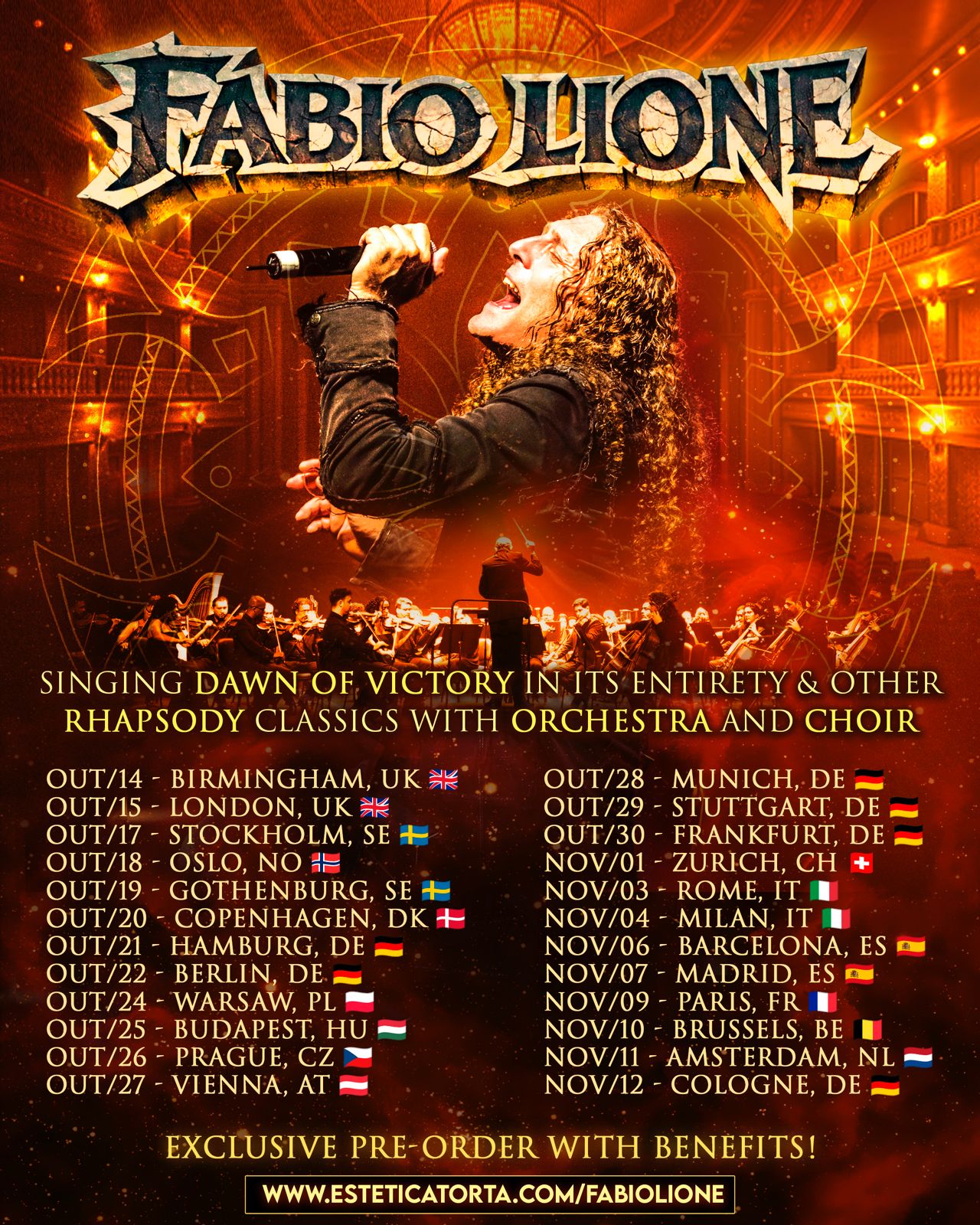 Legendary Voice of Rhapsody, the Italian singer Fabio Lione announces exclusive European tour with orchestra and choir. The tour will feature a unique, never-before-seen show in Europe, showcasing the masterpiece album "Dawn of Victory" performed in its entirety, plus Rhapsody classics backed by a live band, orchestra, and choir.
